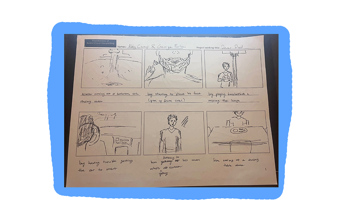 Abby Camp and I started out with developing a logline. "Young man writes a letter to his deceased father and struggles to grapple with the feeling that he’s missed out on time with him and lessons never learned." We then fleshed that out into a multidue of scenes with a handwritten story board to go along with it. Since we had no budget, and our only resources were what we already owned. we wanted focus on what could be a very realistic scenario so our film could come across as proffesional as possible. With such a personal and complex feeling it can be difficult to grasp those kinds of emotions and put what that feels like into perspective.