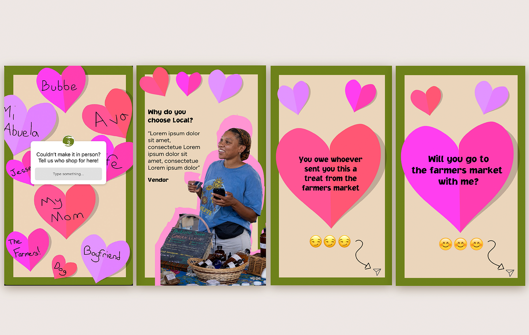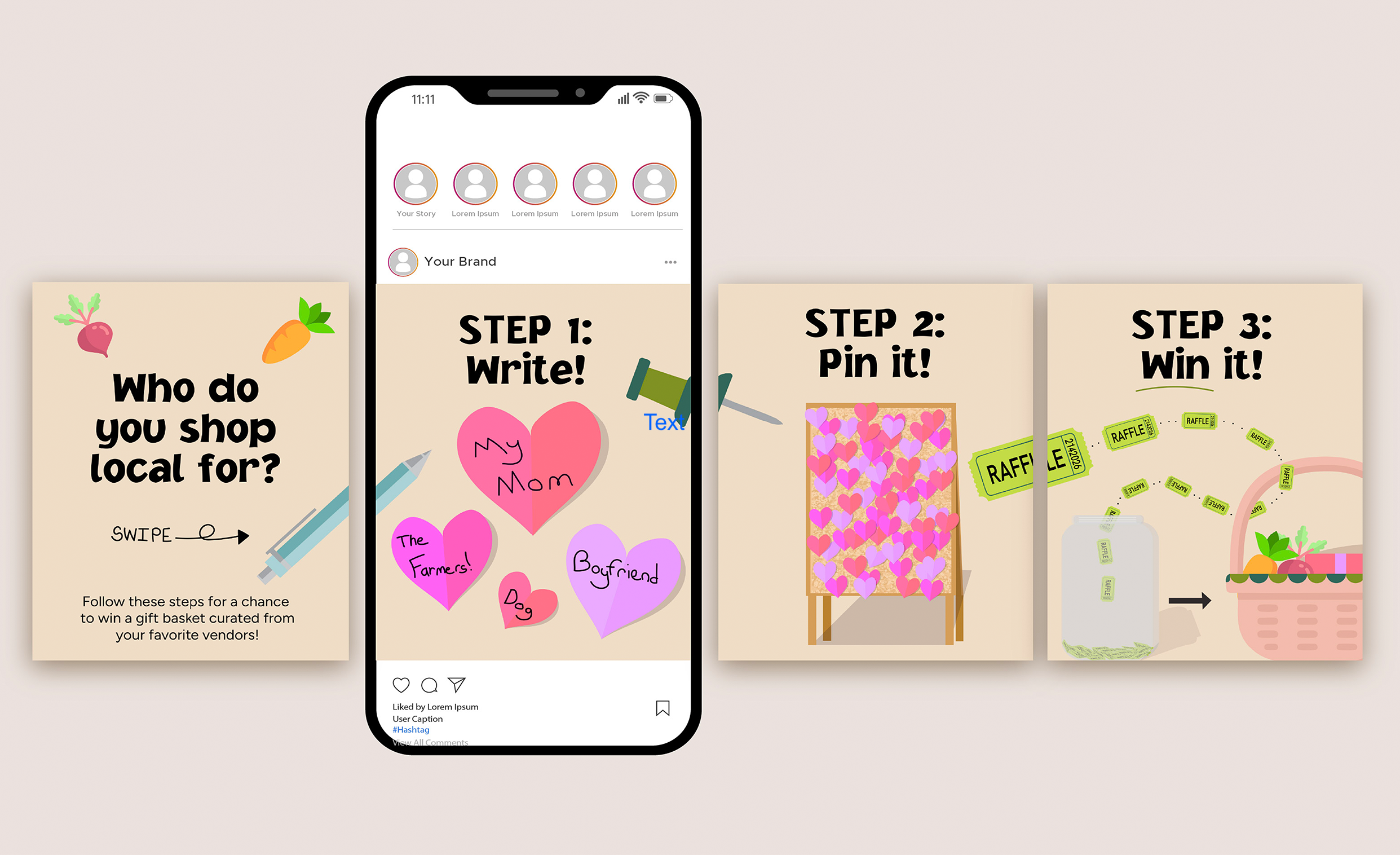 We would make a in-person station at the farmers market. Where people could write who they shop local for on a paper heart and pin it up. This would be accompanied by a step by step post explaining the process as well as stories that highlight why vendors shop local as well as sharable stories to drive foot traffic to the farmers market.